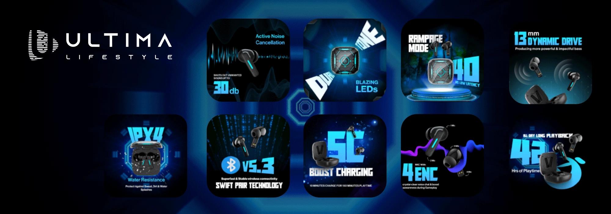 Introducing Ultima Blaze Gaming Earbuds with ANC, 40 ms Low Latency, 5C Boost Charging, IPX4 Water Resistance, 15m Range and Dual Tone built with Blazing LEDs.